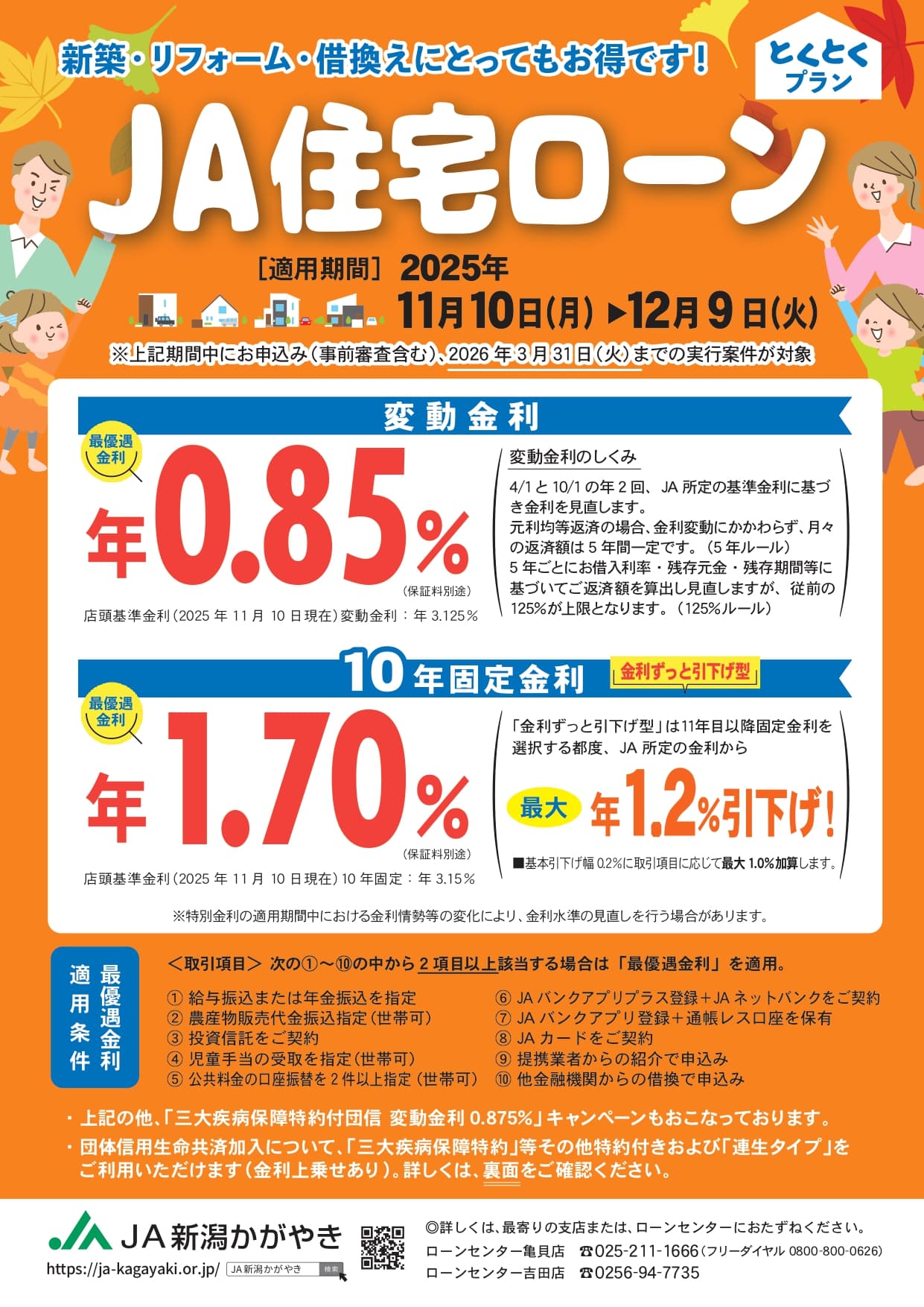 - JA住宅ローンとくとくプランを更新しました(令和7年11月10日~令和7年12月9日)