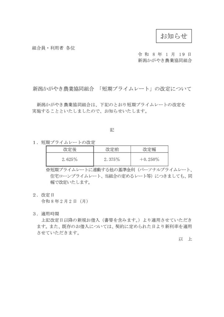 新潟かがやき農業協同組合は短期プライムレートの改定を実施することといたしましたので、下記の通りお知らせいたします。(改定日:令和8年2月2日)