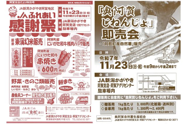 11月23日(日・祝)にJA新潟かがやき阿賀支店・阿賀アグリセンター駐車場内(アクセス)で「JA新潟かがやき阿賀地区ふれあい感謝祭」と「奥阿賀じねんじょ即売会」を開催します!ぜひご来場ください。