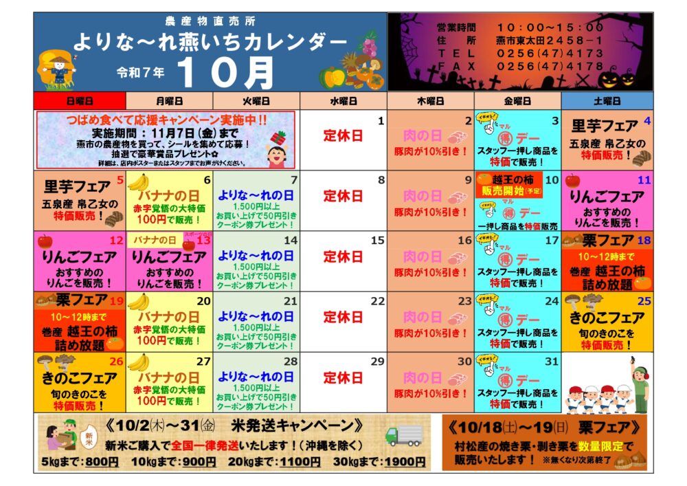 お知らせ 【10月】よりな~れ燕いち★月間スケジュール 2025年10月02日直売所 「よりな~れ燕いち」の月間スケジュールを更新しました。皆さまのご来店を心よりお待ちしています。 【 よりな~れ燕いちスケジュールPDF 】 お問い合わせ先:よりな~れ燕いち 0256-47-4173 « 前の記事へ 一覧