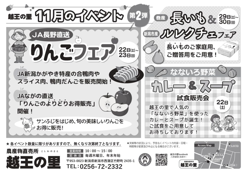 お知らせ 各直売所11月イベント情報・「ル レクチエ」販売情報 2025年11月06日直売所 各直売所11月のイベント情報をお知らせいたします。 西洋梨「ル レクチエ」発送のご予約承り中ですので、ぜひご利用ください。 ファーマーズ・マーケット いっぺこ~と 【PDFはこちら】 ベジらンドにいつ 【PDFはこちら】 越王の里 【PDFはこちら】 よりな~れ燕いち 【PDFはこちら】 お問い合わせは各直売所までお願いいたします。 « 前の記事へ 一覧 次の記事へ »