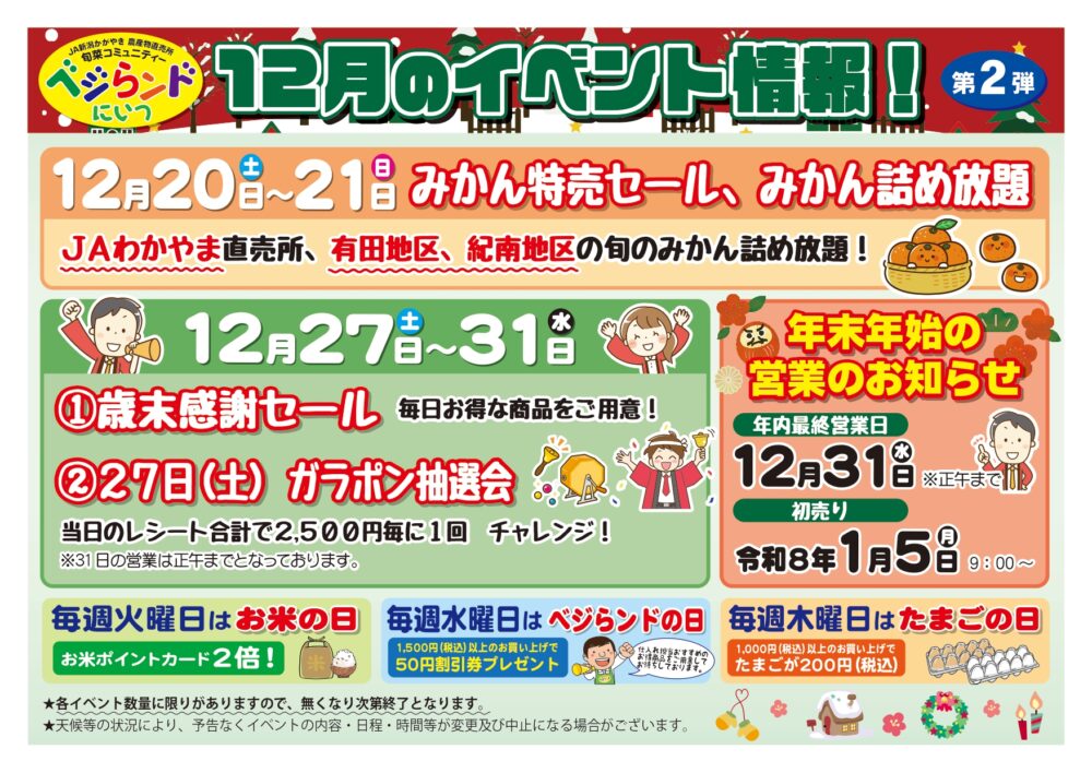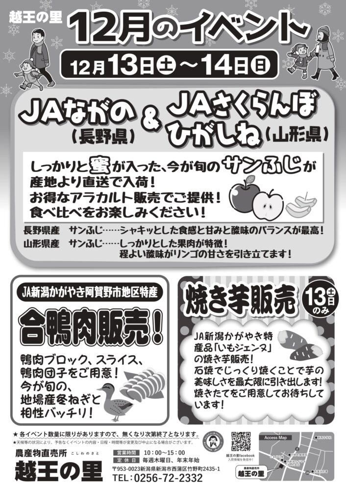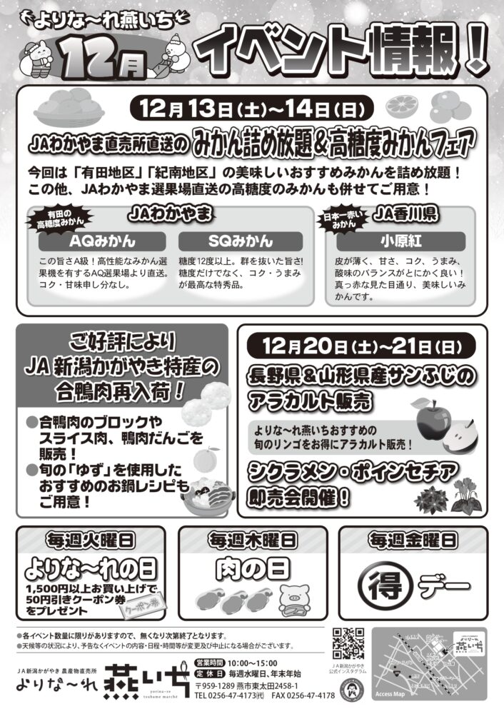 お知らせ 直売所12月イベント情報 2025年12月11日直売所 各直売所12月のイベント情報をお知らせいたします。 ファーマーズ・マーケット いっぺこ~と 【PDFはこちら】 ベジらンドにいつ 【PDFはこちら】 越王の里 【PDFはこちら】 よりな~れ燕いち 【PDFはこちら】 お問い合わせは各直売所までお願いいたします。 « 前の記事へ 一覧