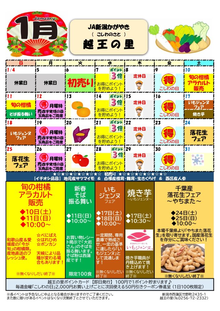 お知らせ 【1月】越王の里直売所★月間スケジュール 2025年12月26日直売所 「越王の里」の月間スケジュールを更新しました。皆さまのご来店を心よりお待ちしています。 越王の里月間スケジュール(PDF) お問い合わせ先:越王の里直売所 0256-72-2332 « 前の記事へ 一覧 次の記事へ »