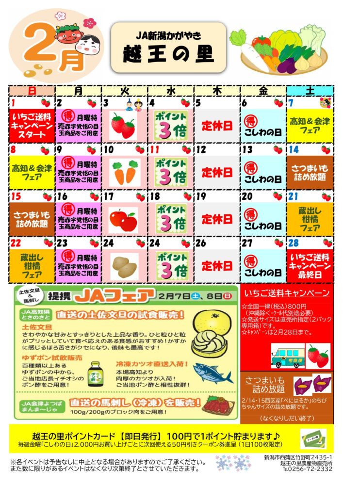 お知らせ 【2月】越王の里直売所★月間スケジュール 2026年01月30日直売所 「越王の里」の月間スケジュールを更新しました。皆さまのご来店を心よりお待ちしています。 越王の里月間スケジュール(PDF) お問い合わせ先:越王の里直売所 0256-72-2332 « 前の記事へ 一覧 次の記事へ »