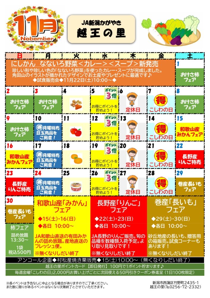 お知らせ 【11月】越王の里直売所★月間スケジュール 2025年11月04日お知らせ 「越王の里」の月間スケジュールを更新しました。皆さまのご来店を心よりお待ちしています。 越王の里月間スケジュール(PDF) お問い合わせ先:越王の里直売所 0256-72-2332 « 前の記事へ 一覧 次の記事へ »
