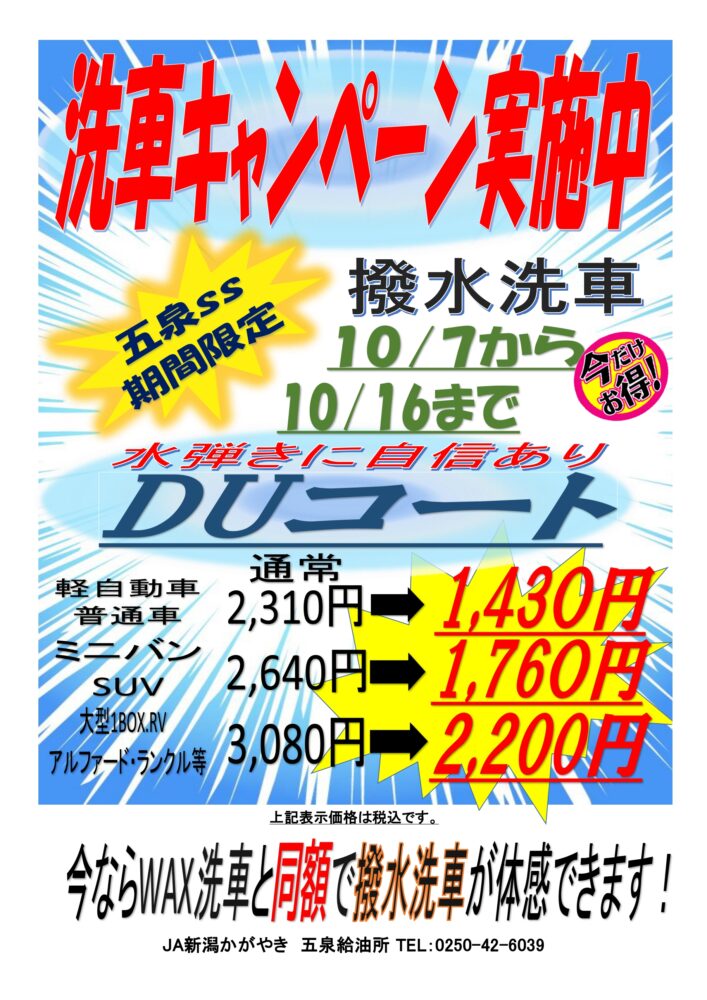 お知らせ 五泉給油所で洗車キャンペーンを実施します! 2025年10月01日車・農機・給油所 日頃よりJA新潟かがやき給油所をご利用いただき、誠にありがとうございます。 五泉給油所では 10/7(火)~10/16(木)までの間、『洗車キャンペーン』を実施いたします! 抜群の撥水力の「DUコート」が今だけの特別価格! 皆さま、是非ご利用ください! 【PDFはこちら】 お問い合わせ:五泉給油所 0250-42-6039 « 前の記事へ 一覧