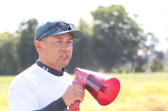 会場は、JA新潟かがやきささかみライスセンター前の圃場です。5月の同ツアーで田植えを行った後、圃場を管理してきたエコファームささかみ株式会社の一ノ瀬専務取締役は「今年は、猛暑や雨が全く降らない日が続くなど、農業の難しさを感じる年だった。ツアー圃場は用水から水を得ることができ、猛暑の影響を避けることができた」と参加者に向けて説明しました。