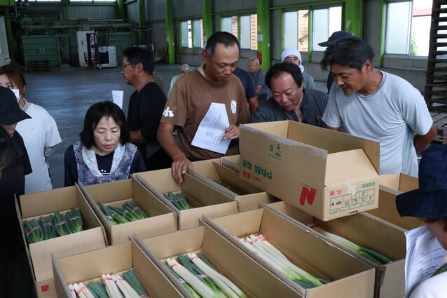 10月3日には、同施設で目合わせを開き、生産者やJA担当者、市場関係者など約30人が集まり、規格や品質管理について確認しました。