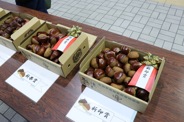 JA新潟かがやき村松栗組合は23日、栗の品質を競う「村松栗共進会」を五泉市さくらんど会館で開催しました。最優秀賞にあたる五泉市長賞は今井一智さんの「石鎚」が受賞しました。今年から新たに新潟中央青果(株)と(株)新津食品流通センターの担当者が審査員に加わり、新潟中央青果(株)が決める新印賞と(株)新津食品流通センターが決める新果賞を新設しました。新印賞は泉和夫さんの「美玖里」、新果賞には同組合の川瀬和博組合長の「紫峰」が選ばれました。