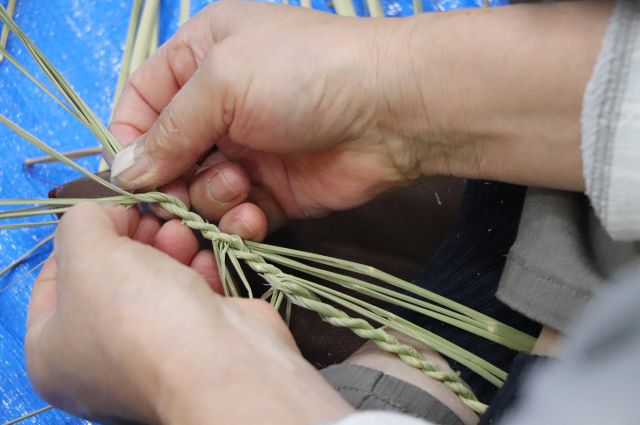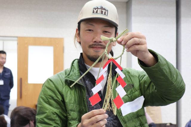 今年初めて参加した木村さんは「ベテランの手つきを見て、最初はできそうにもないと思った。丁寧に教えていただいて、自分でも1本の縄を作り上げることができ、とても感動した」と笑顔で話しました。2時間ほど縄綯いを練習すると、ベテラン部会員の指導下で、主に初心者が担当する「輪飾り」を完成させました。