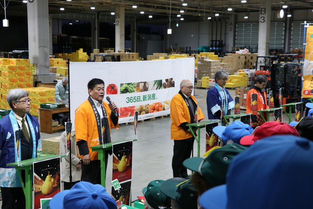 初競り前にはJA全農にいがたと新潟かがやき、佐渡、えちご中越の3JAの生産者や代表者らが、市場関係者に味や品質をアピールしました。
