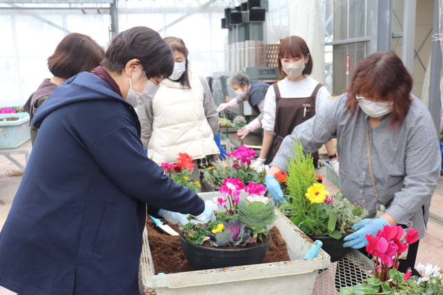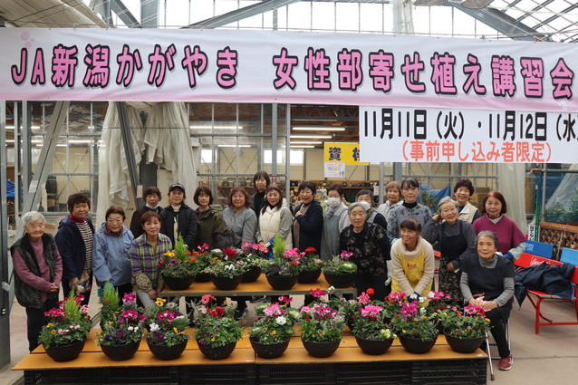 JA新潟かがやき女性部本部は11月11日と12日の2日間、花夢里にいつで「寄せ植え講習会」を各日午前と午後の計4回開催いたしました。合併後から毎年恒例となっている講習会で、今年も多くの部員が参加し、会場は終始和やかな雰囲気でした。