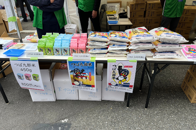 当日は、ファンと選手が交流できるイベントや、ステージイベント、グッズ販売などが行われ、会場は大いに賑わいました。物販の燕市ブースでは、つば九郎米の新米や、つば九郎米を使ったおにぎり、弁当などを販売し、開始前から多くの人が列を作っていました。
