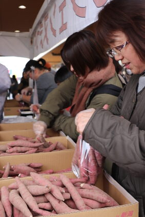 まつりでは、「いもジェンヌ」を使った大判焼きやジェラート、大学いもやコロッケなどの総菜、生芋の特価販売を行いました。市内の飲食店がブースを出店し、「いもジェンヌ」を使ったスイーツやパン、リキュールなどの販売やお絵かきコンテストも開催しました。焼き芋売り場から漂う甘い香りに長い列ができました。当日同直売所で3,000円以上購入した人限定で、小芋の詰め放題を行いました。