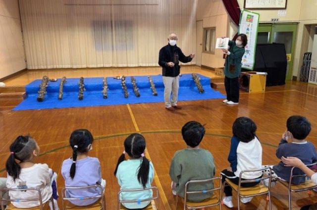 園に原木9本を持ち込み並べると、園児たちは目を輝かせました。あがのアグリセンター職員が、原木シイタケが同市の特産品であることや同市内には生産者が3人いることを説明しました。
