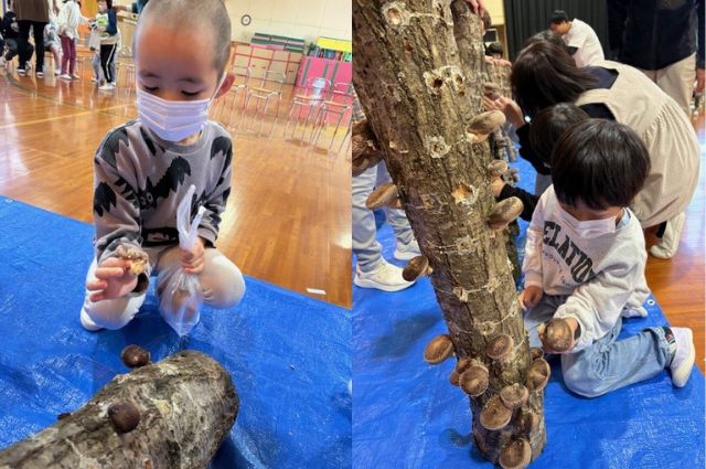五頭椎茸(ごずしいたけ)生産組合の皆川さんが園児の収穫体験に協力。収穫方法を実演した後、園児が実際に収穫しました。