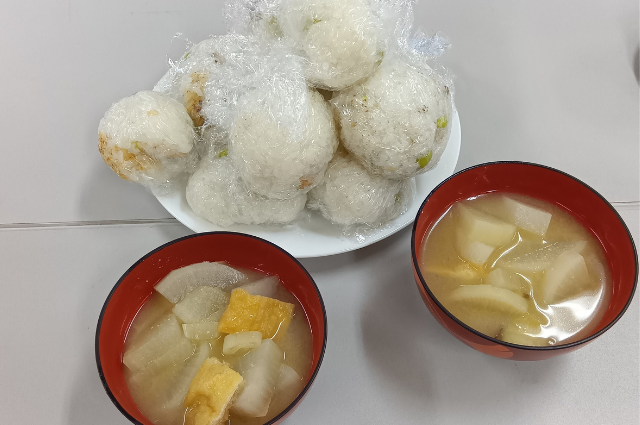 収穫祭では、朝から児童が準備した「枝豆入りおにぎり」と、さつまいも、大根、ねぎ、油揚げが入った「さつまいもの味噌汁」が参加者にふるまわれました。