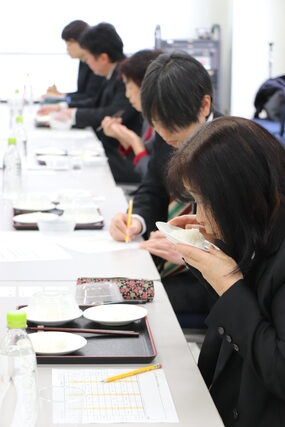 最終審査となる3次審査では、食味官能審査を実施しました。審査員は7人で、新潟薬科大学の大坪研一教授をはじめ、新潟地域振興局農林振興部の江口喜久子副部長や同JA経営管理委員会の遠藤一雄副会長、JA青壮年連盟委員長、JA女性部長、一般審査員として准組合員の代表が務めました。