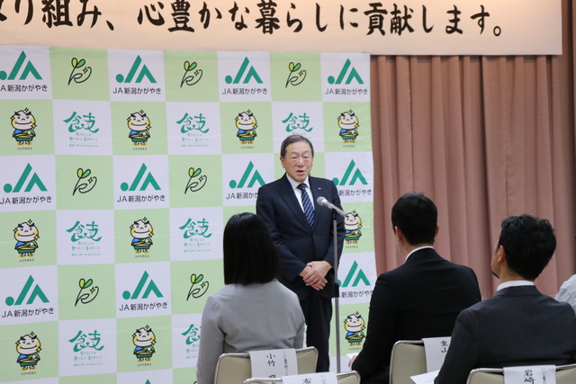 同JA経営管理委員会の遠藤一雄副会長は「このように多くの方が就農されたことに感謝したい。今後、みなさまの活躍によって地域の文化と農業振興がさらに大きく発展することを願っている。もし何か問題があれば、ぜひJAに相談してほしい。一緒に解決していきたい」とあいさつしました。