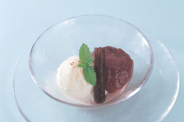 - 器に盛りつけ、バニラアイスを添え、その上にシナモンパウダーをふりかける。最後にミントを飾る。