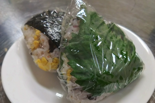 - のりで作る場合、ラップの上にのりを敷き、混ぜた材料を平らにのせます。のりの上下の端が重なるように包み、形を整えます。