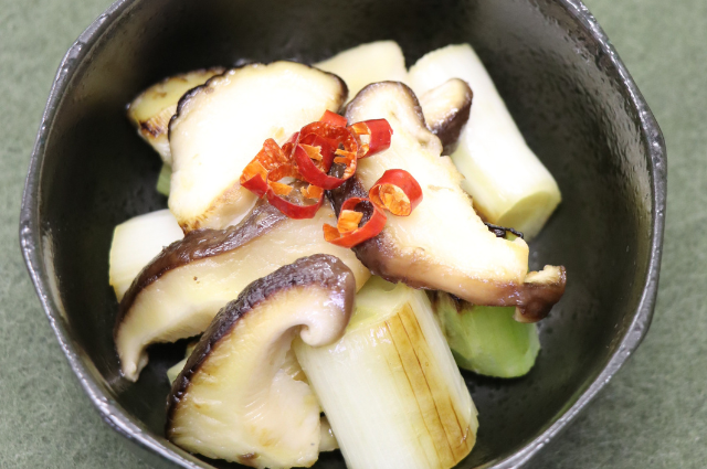 2. フライパンにオリーブオイルをしき、シイタケと長ネギを炒める。長ネギに焼き色がついたららっきょう酢を入れる。ひと煮立ちさせたら出来上がり。