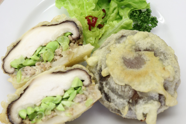 4. ①のエダマメと③の豚ひき肉炒めを4等分にし、シイタケの内側にエダマメ、豚ひき肉炒めの順にのせ、薄切りした餅で蓋をする。
